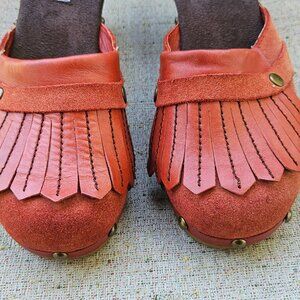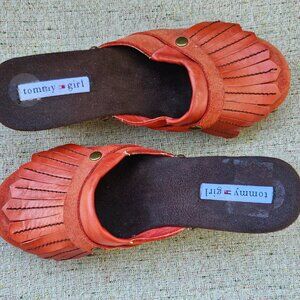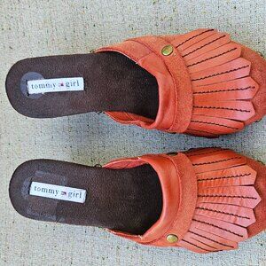 Tommy Women Shoes Wedge Heel Mule Studd Red Leather Fringe Shoes Size 7M