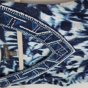 Beautiful blue print dress. Beaded detail at v-neck line. Elastic drop under bust line, hangs straight.