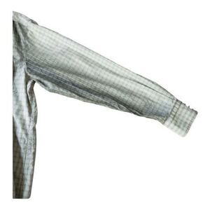 Tommy Bahama Men's 55% Silk 45% Cotton Green Ombre Plaid Pattern, Collared, Button-Up, Long-Sleeve, 1 Chest-Pocket, Shirt Size M. Great Pre-owned Condition with no holes. HAS TWO SMALL STAINS AT THE END OF THE LEFT SLEEVE, NOT TOO NOTICEABLE, SEE PICTURES PLEASE. For material and care see pictures please.