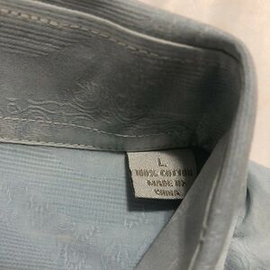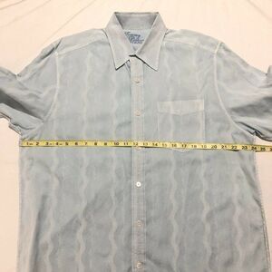 Tommy Bahama Denim Mens Button Front Long Sleeve Shirt. Gently preowned in good overall condition. No rips or holes. Does have small spot/discoloration on back; see pics. 100% Cotton denim. Single chest pocket. Pattern is kinda like a paisley/floral striped design. Really nice print.