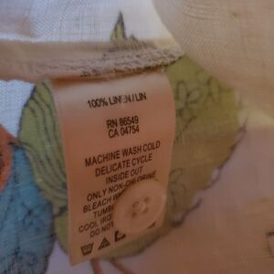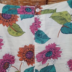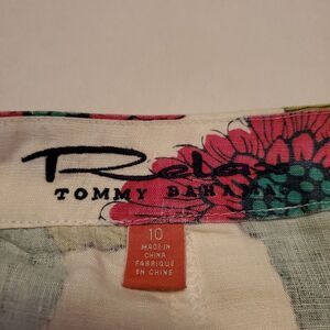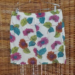 This is a Tommy Bahama linen skirt. It has a beautiful flower print. There are 2 pockets, a zipper on the upper front, and a button at waist.