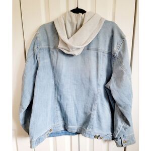 This Tommy Hilfiger 2X Hoodie for women is a stylish denim jacket with a full zip closure and drawstring neckline. It features logo patches and a biker jacket theme, giving it a unique and trendy look. The hoodie is designed with a hood, long sleeves, and a comfortable cotton/poly/elastin fabric blend in an acid-wash denim color. Perfect for travel or casual wear in winter, summer, fall, or spring, this jacket is a versatile addition to any wardrobe for those who prefer a plus-size fit.