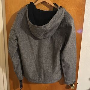 This is new with tags. The color is gray. The soft shell is 100 % polyester. The lining is 100 % polyester. Fleece sherpa body and hood. The sleeves are quilted lined. Side zip pockets. Adjustable hood. The chest is 46 inches, 23 flat. The length is 27 inches. The sleeves are 27 inches with snap cuff. This is heavy and well made.