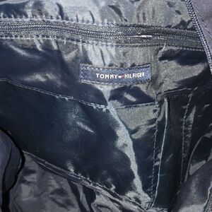 Navy duffel bag featuring bold Tommy Hilfiger logo straps. Ideal for travel or gym.