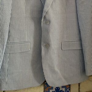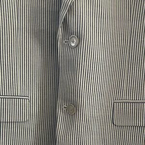 Sophisticated navy pinstripe blazer. Classic design. It’s a men’s suit blazer, can definitely be unisex. Does not have size tag. Measurements are listed below. Outside material is cotton and lined polyester on the inside and also lined on the inside sleeves. Faux pockets on the front, 3 functional pockets on the inside.