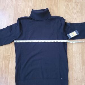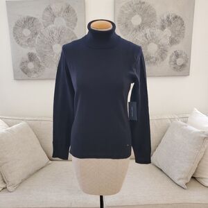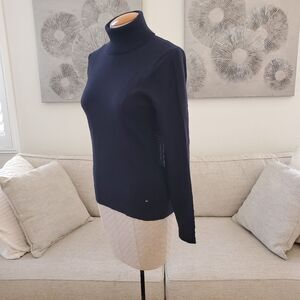 Tommy Hilfiger elevates the traditional turtleneck sweater with buttoned cuffs and a ribbed hem for added style.