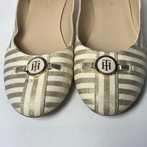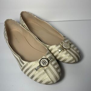 Tommy Hilfiger Ballet Flats 10Medium Shoes Low Heel Striped Gold Sandal. Condition is very good some slight marks on the toe tips. Tommy Hilfiger logo on the top. Barely worn