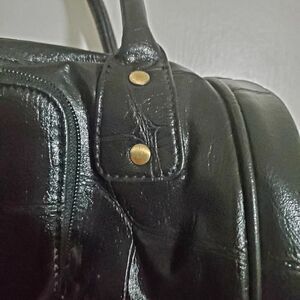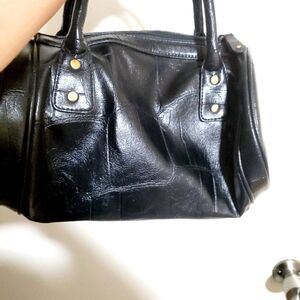 Black handbag with a golden monogram accent. Zipper accent closure. Pre-owned in good condition. Please refer to pictures for best description, condition verification, and measurements.