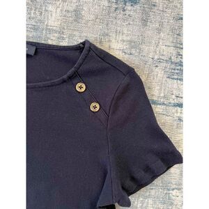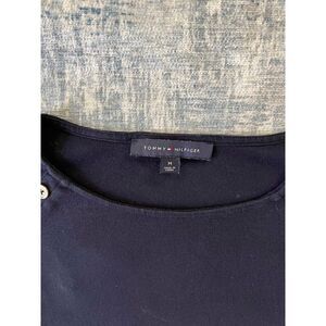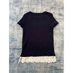 Dark navy blue tee from Tommy Hilfiger has decorative buttons on the shoulders, and white lace floral trim at the hem.