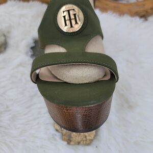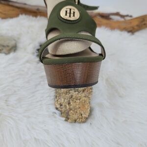 dark moss green strappy wedge shoes. excellent condition. gold logo. Preloved condition. All sections of interest as well any known flaws have been documented in the photos and noted as thoroughly as possible. if there are no known flaws, none will be noted. Please feel free to ask any questions before purchase 🙂.