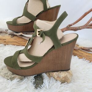 dark moss green strappy wedge shoes. excellent condition. gold logo. Preloved condition. All sections of interest as well any known flaws have been documented in the photos and noted as thoroughly as possible. if there are no known flaws, none will be noted. Please feel free to ask any questions before purchase 🙂.