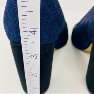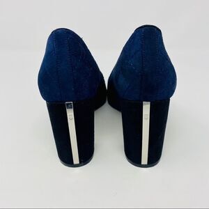 Very nice Tommy Hilfiger quilted heels in a beautiful blue. They have a pointed toe with black suede tops caps and chunky heels with a silver bar running down the back of the heel.