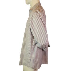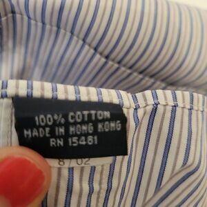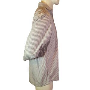 Multicolored, small stripped pattern, collared, long sleeves, cuffed, button down, regular fit, lightweight, breathable and very comfortable. Please note, there is a small snag on sleeve and small stain on front of shirt both are barely visible but are there.