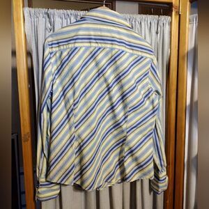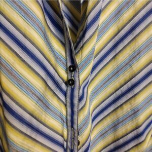multi colored striped shirt, double buttons, semi fitted
