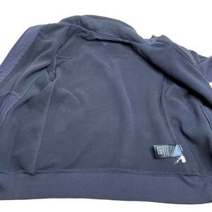 Tommy Hilfiger navy blue full zip jacket size M. Style 0181772. Front zipper pockets. Side arm pocket. Spelled out logo on back standup collar. Fleece lining. Some signs of wear but still good condition. Face 59% cotton 39% polyester 3% elastane. Back 100% polyester woven 100% nylon. Length 26” Chest 20”.