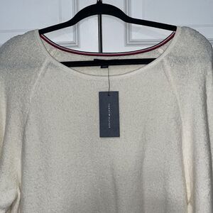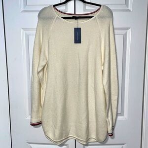 Tommy Hilfiger off scoop neck white sweater with red and blue detail on inside of collar and sleeves. Round bottom with longest point at 35 inches. Pit to pit is 24 inches. Super soft! NWT