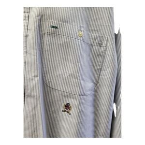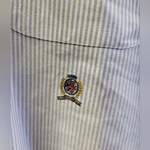 GUC button down shirt that's nice looking with two stains looks like coffee stain see for yourself on cuff and top of shoulder. Great quality 100% cotton is tough. This a striped shirt blue and white.