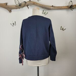 Relaxed fit crewneck style sweatshirt top with thick ribbon red white and blue laces that lace through grommets. Gently preloved condition. Any flaws are noted.
