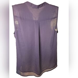 Tommy Hilfiger sleeveless top features a stylish ruffled front, perfect for adding a touch of sophistication to any outfit. Silver hardware on tie strings. Sheer but lined. The rich navy blue color makes it a versatile choice for both casual and formal occasions. 16"shoulder to shoulder x 20 pit to pit x 24L x 20Waist. Please note that this is a true navy blue but the pics look purplish. It's a very pretty blouse in perfect condition.