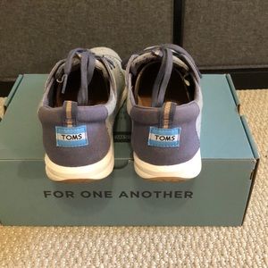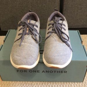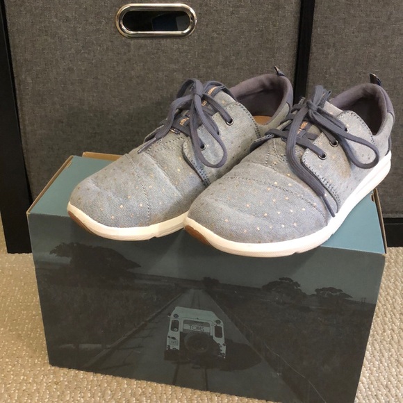 Hard sole lace up Toms. Light smoke blue colored with darker back and laces. Has gold polka dots throughout.