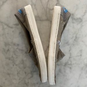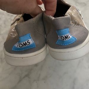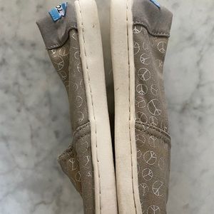 Toms slip ons. Silver peace signs on beige shoe. Worn once. VGUC. Size 1.5