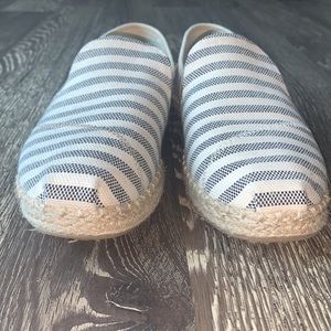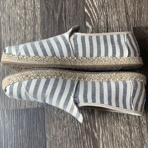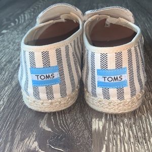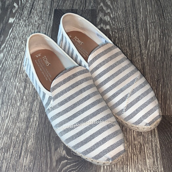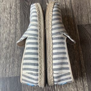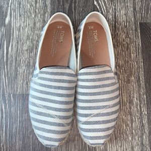 EUC Toms espadrilles. Black and cream in color. I did cut the elastic that runs across the top of the foot. It does not affect how the shoe fits, I’d say they are still very snug. Removable insole. I may still have the box, if so I’ll ship in that.