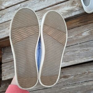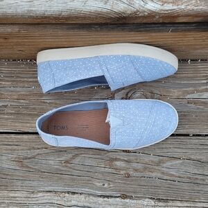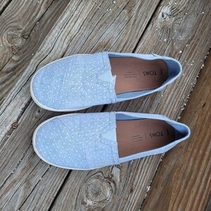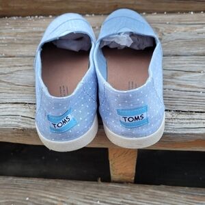 Toms Avalon Canvas Slip On Sneaker. Women's size 6.5. Preowned in good condition. Blue with white polka dots. TOMS Avalon is an evolution of our classic slip on espadrille with an elastic v gore notch for comfortable fit and a rubber outsole for increased traction.