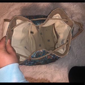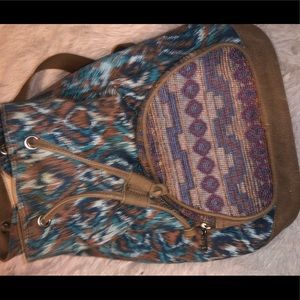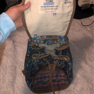 Boho pattern Tom’s backpack, snap button and drawstring closure. Has front zipper pocket. Lightly used.