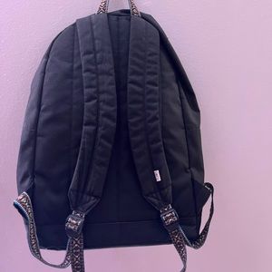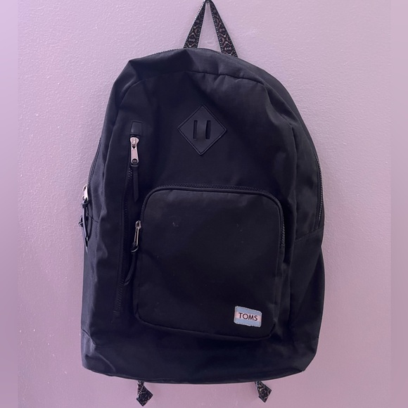 Black Toms backpack with 2 external pockets. Large interior pocket also has padded laptop separator and small pencil pocket. Straps are comfortably padded and straps and top “hang” straps feature tribal inspired pattern. Front pocket shows some wear after previously holding pins but back is still sturdy. Used as a senior in high school and 2 years over undergrad with no issues.
