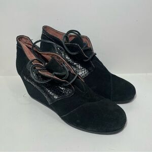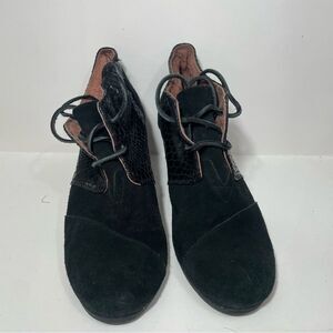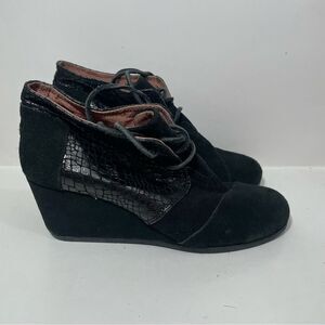 Gently worn women’s size 10 Toms black snakeskin wedge booties. Please review all photos for any signs of wear-pictured as is. Disclaimer: Any items with any wear/staining has not been treated, and unsure of ability to remove/treat condition. Comes from a smoke free home, bundle with other items to save & minimize shipping cost.