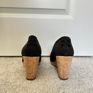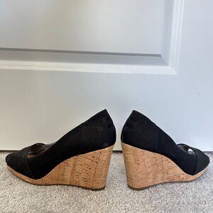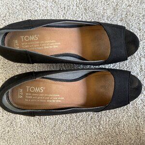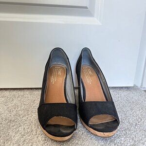 Classic black shoes are a staple in any closet. These black peep toe wedges from Toms are gently loved and a comfortable heel to wear. Perfect for any function where you want to add a little fun to your outfit.