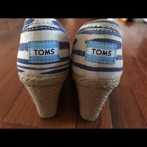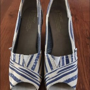 Blue and white TOMS wedge sandals. I bought it while I was pregnant and now they don't fit anymore. Never got the chance to wear them so they are practically new! I love this pair and have been holding out hoping that things would change (like my new feet size) but doesn't look like it's gonna happen. Please buy this beauty, you'll love it. Size 6.5w