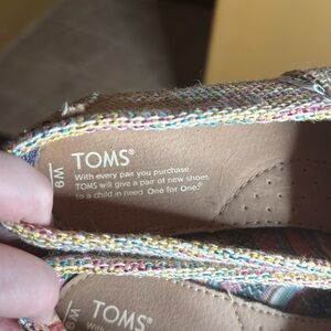 These shoes are adorable and so comfortable! Gently used Tom's in a pink/blue slightly sparkly burlap. You can wear these around the house or throw them on in a jiffy to run errands. Always worn with socks, these shoes do not have any odor and are in great condition. There are no rips or any signs of wear on the upper. Smoke free environment. Fit true to size.
