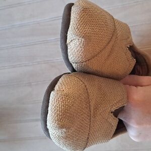Neutral beige woven upper, signature diagonal toe-stitch, and elastic V-notch for easy on and off. Soft cushioned insole with fun multicolor tribal print lining. Textured, woven.