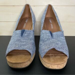 Toms Classic Wedge Peep Toe Heels Women's Size 8.5 Shoes Blue White Cork Slip-On