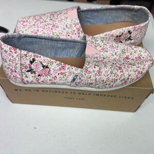 Women’s size 8.5 Tom’s Classic shoes Pink embroidered flowers roses. Slip on shoes with box. Gently used good condition.