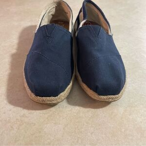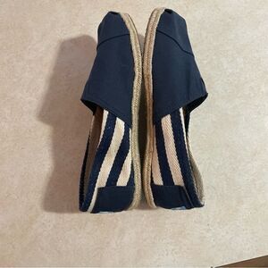 Women’s size 10 navy blue and white/ tan striped espadrilles Tom’s. Great condition. Classics university flat slip on shoes.