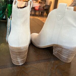 These Toms ankle booties feature a smooth, leather-like material in a solid white color, offering a clean and minimalist look. With a rounded toe and slip-on style, they provide both comfort and ease of wear. The moderate heel height adds a touch of elevation, making them perfect for everyday versatility.