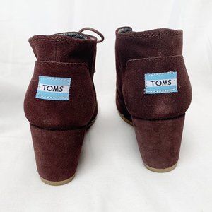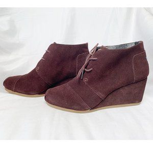 New without tags or box - Toms "Desert Wedge Bootie" in chocolate Brown suede, Size 9.5. Wedge is approx 3 inches at the heel. Lace up closure, rubber sole.