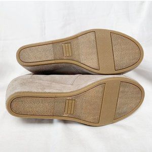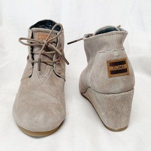 New without tags or box - Toms "Desert Wedge Bootie" in Taupe/Tan/Light Gray suede, Size 9. Wedge is approx 3 inches at the heel. Lace up closure, rubber sole.