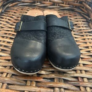 Tom's Elisa Wooden Heel Clog Black and Cream Leather Mules with Buckle