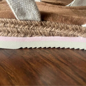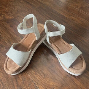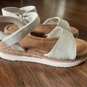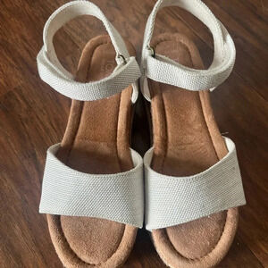 These are brand new with no tags and a girl size 3. These are from the brand Toms. These are a cream with hints of tan throughout the fabric of the sandal. The wedge sole is cream and pink with rattan weave above the sole. These are super stylish for any Spring or Summer dress! All of my items are as described and come from a smoke-free home. I am always open to considerate offers. Thank you for looking!