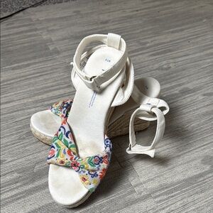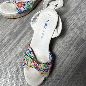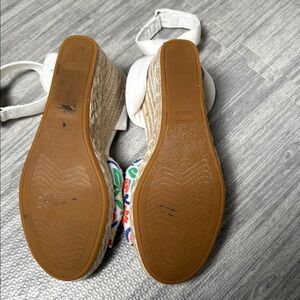 Adorable floral sandals made by Tom’s with a white base and shades of orange blue green and yellow print. The heel is a braided look along with a Velcro ankle strap. Super comfortable. Looks great with jeans, shorts, or dresses. Wedge height is 3 1/2 inches. Very, very minor discoloring under the area where your toes go as shown in the photos
