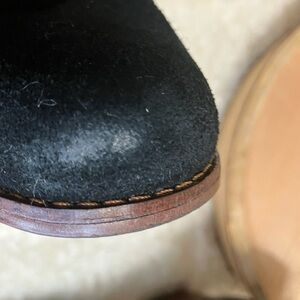 These super cute ankle boots are in very good condition. They have very light wear. There’s a small chip from the left heel as pictured. And there is thinning at the right toe as pictured. Otherwise, I do not see any wear or damage. They are also very clean.