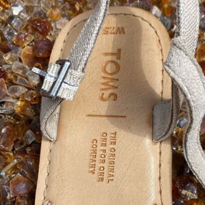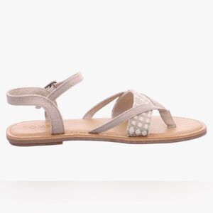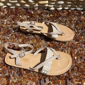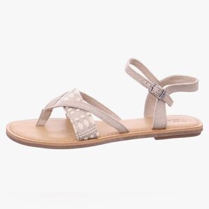 Toms Lexie Novelty Tribal Print Beige/White Canvas Sandal. Size 7.5. Excellent Condition- Like New! Slip on these strappy sandals for a stylish way to get around on those sunny days out. These versatile natural-colored sandals pair well with shorts, skirts and jeans for a casual look that's great for everyday wear. Lightweight cushy footbed brings comfort to a chic summer sandal accented with a fun, two-tone woven strap. Adjustable ankle strap with buckle closure. Textile and leather upper and lining/synthetic sole. Ships from a smoke and pet free home.