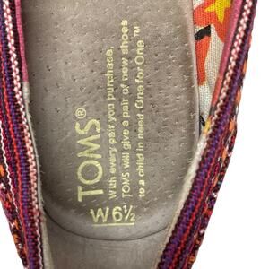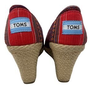 Toms Lina Aztec Print Peep Toe Espradille Wedges. Size 6.5. Peep toe shoes with fabric lining. Jute and woven cording wrap the wedge heel. Toms logo at back heel. Some dried glue showing where jute is wrapped at wedge. Otherwise in great preowned condition.