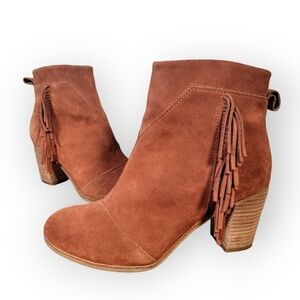 Toms Lunata Brown Cognac Rust suede fringe heel Booties boho western Size 8.5