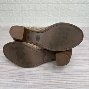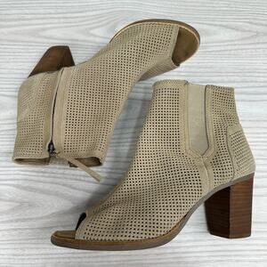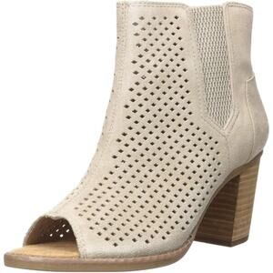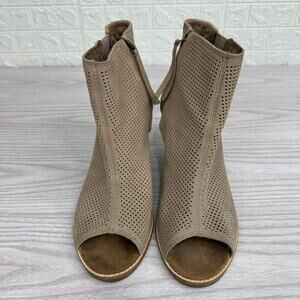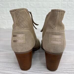 Toms Majorca Booties WMNS 9.5 Tan Diamond Perforated Suede Peep Toe Block Heels