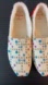 Vibrant Toms slip-ons with Scrabble print. Features cream, black, blue, and pink colors. New with tags.