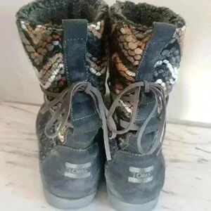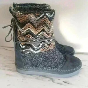 Stylish and warm! In great condition! Suede at the toe. Inner fleece. Cushioned foot bed. Leather lace around strap detail. Some staining on the toe but shown in last photo. Comes from a smoke-free and pet-free home